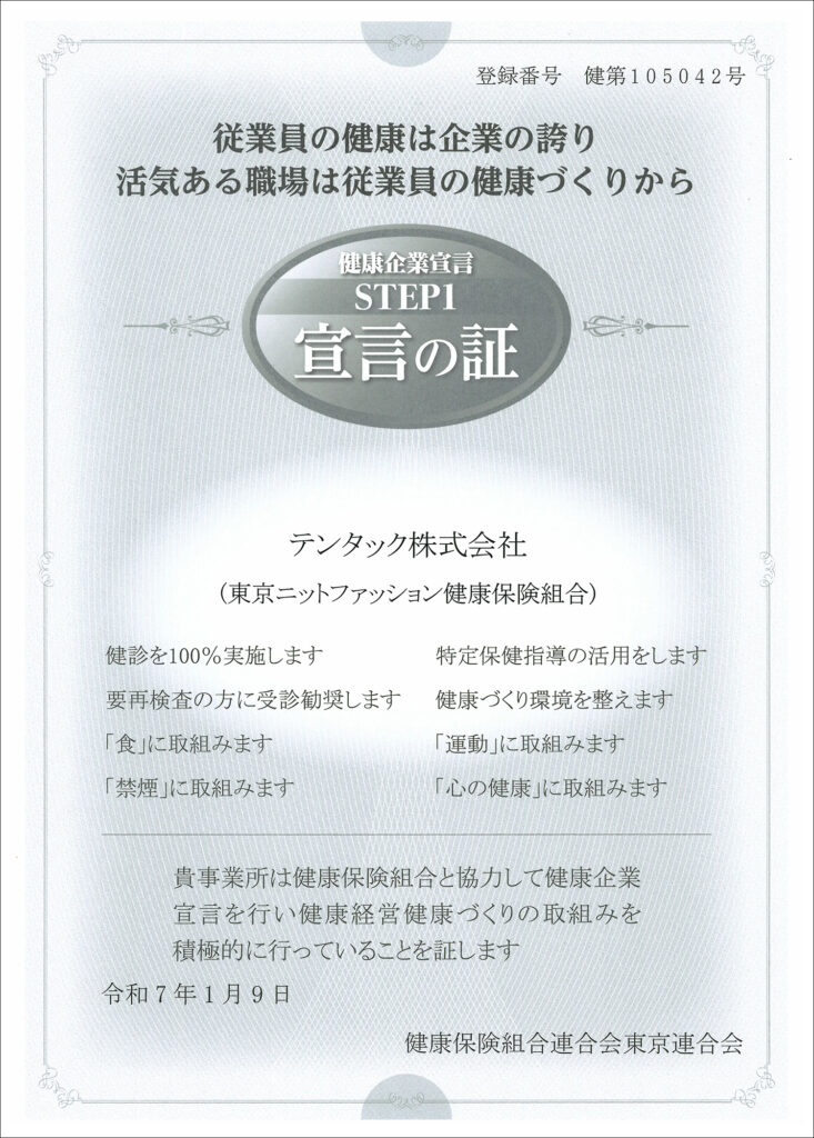 2025.01.15お知らせ2025.1月 健康企業宣言いたしましたテンタック株式会社は“健康で安心して働ける職場づくり”を企業の責任と考え、従業員の健康のための活動に取り組んでまいります。アパレル副資材事業ブランドラベルやパッケージなどを自社工場を活かして生産し、安定した品質で製品に付加価値を提供します。アパレル副資材事業へRFIDソリューション事業在庫管理などの効率化を実現するRFIDタグを提供し、業界課題に応じたカスタム対応で国内トップシェアを誇ります。RFIDソリューション事業へサステナブル素材事業環境配慮型のリサイクル素材やエコRFIDを展開し、持続可能な未来を支援しています。サステナブル素材事業へWhat is RFIDRFIDについてより詳しい情報を掲載しています。初めての方でも分かりやすく解説します。What is RFIDへお知らせ・コラム一覧へ