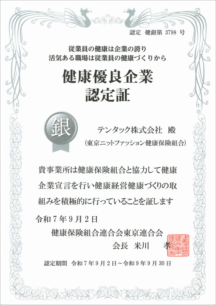 2025.09.10お知らせ「銀の認定」を取得いたしました銀の認定とは、健康保険組合連合会 東京連合会が実施している「健康企業宣言」制度の中で、一定の健康経営の取り組みが評価された企業に与えられる認定です。アパレル副資材事業ブランドラベルやパッケージなどを自社工場を活かして生産し、安定した品質で製品に付加価値を提供します。アパレル副資材事業へRFIDソリューション事業在庫管理などの効率化を実現するRFIDタグを提供し、業界課題に応じたカスタム対応で国内トップシェアを誇ります。RFIDソリューション事業へサステナブル素材事業環境配慮型のリサイクル素材やエコRFIDを展開し、持続可能な未来を支援しています。サステナブル素材事業へWhat is RFIDRFIDについてより詳しい情報を掲載しています。初めての方でも分かりやすく解説します。What is RFIDへお知らせ・コラム一覧へ