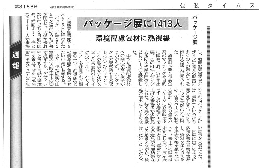 その際に展示した環境配慮型包材「ハザイナノ」について、2025年10月13日発行の業界紙『包装タイムス』4面で紹介されました。