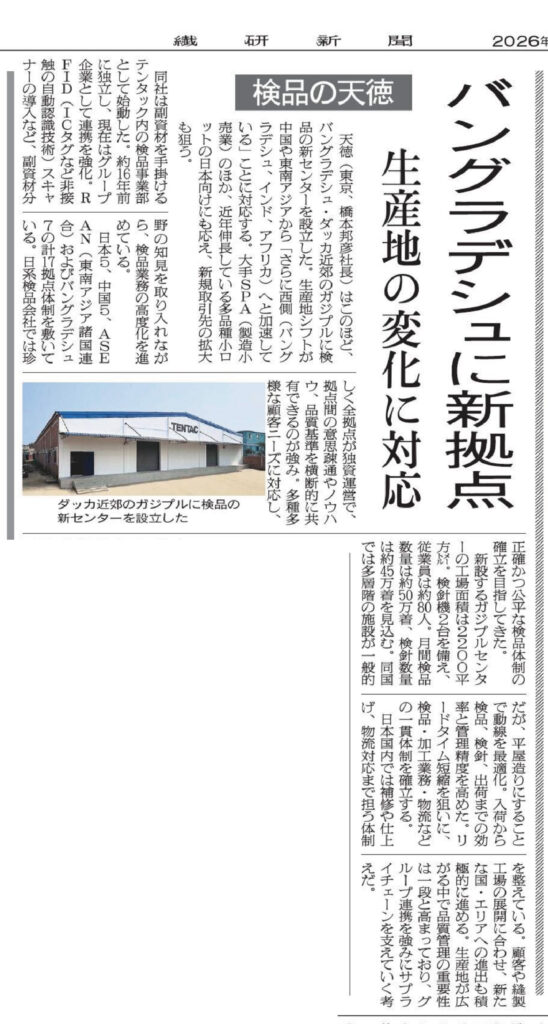 天徳(東京、橋本邦彦社長)はこのほど、バングラデシュ・ダッカ近郊のガジプルに検品の新センターを設立した。生産地シフトが中国や東南アジアから「さらに西側(バングラデシュ、インド、アフリカ)へと加速している」ことに対応する。大手SPA(製造小売業)のほか、近年伸長している多品種小ロットの日本向けにも応え、新規取引先の拡大も狙う。