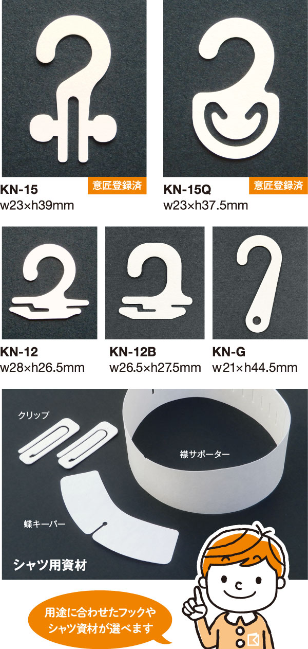 独自開発形状の「クイックフック KN-15Q」は従来の紙フックと比べ、装着時の時間を大幅に削減することが可能です。一点当たり数秒であっても、積み重なれば大きなコストになります。また、装着時に指の力を使う従来型の形状と異なり、手首の動きだけで取り付けが可能なクイックフックは作業者の負担も少なく、大量の取り付けを連続で行う場合にも好評です。